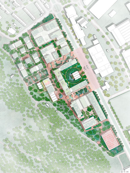 Auf dem ehemaligen Kodak-Areal in Stuttgart Wangen entsteht ein neues Innovationsquartier mit Modellcharakter für die innovative Kombination von Wohnen, Arbeiten, Produktion und Erholung. Der Entwurf zeichnet sich durch eine hohe bauliche Dichte, eine vielfältige Nutzungsmischung sowie naturnahe Frei- und Aufenthaltsräume aus. Durch seine robuste, städtebauliche Struktur, kann auf verschiedene Nutzungsanforderungen und zukünftige Veränderungen flexibel reagiert werden. Die städtebauliche Struktur mit klar definierten Freiräumen, besteht aus stark durchmischten Clustern, welche sich wiederum aus unterschiedlichen hybriden, zirkulären und innovativen Bebauungstypologien und Nutzungen zusammensetzen. Die Strukturen umschließen den zentralen Quartiersplatz, der im Herzen des Quartiers dasselbige verbindet und die linearen Grünräume durch das Quartier anschließt. Über dieses Netz gewinnt das Quartier seinen hohen Gemeinschaftswert und seine Anschlussfähigkeit an Wangen, das Zusammenwachsen des Quartiers mit seiner Umgebung trägt. Durch die unterschiedliche Adressbildung, die sorgfältige Nutzungsverteilung sowie das Angebot an gemeinschaftlichen Infrastrukturen, kann die direkte Mischung von Wohnen und Arbeiten verträglich gestaltet werden.