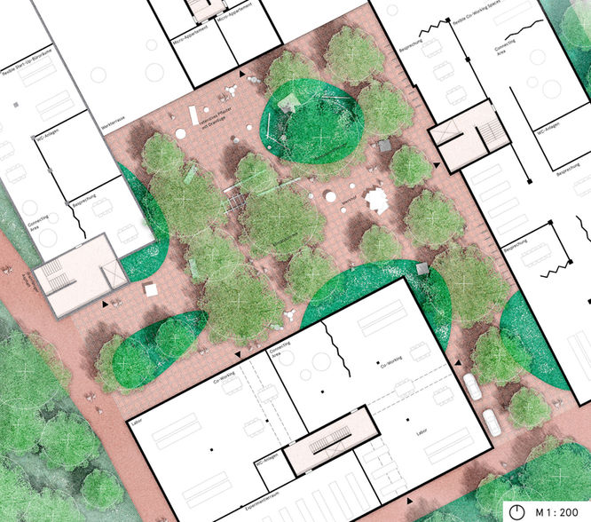 In den produktiven Einheiten, wird gearbeitet, sich ausgetauscht und Synergien geschlossen. Die zwischen den Clustern liegenden linearen Grünräume geben dem Quartier seine Adressen und bieten wohnungsnahe Spiel- und Aufenthaltsbereiche. Die Quartiersmitte, als Quartiersplatz im Herzen des Areals fungiert als Treffpunkt und Mittelpunkt. Die über die Realisierungsphasen wohl ausgewählten initialen Bausteine, geben dem neuen Quartier, bereits im frühen Stadium eine neue und eigenständige Identität.