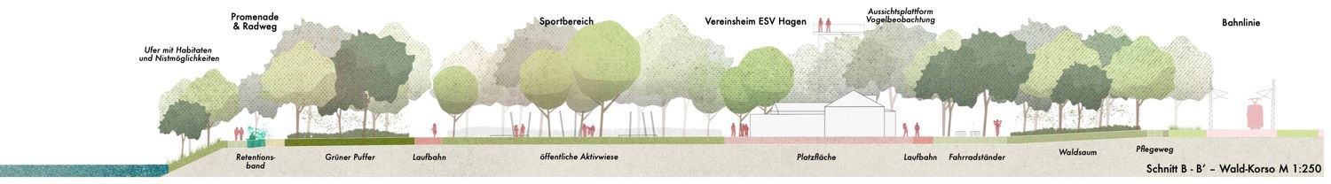 Der Bereich rund um die Vereinssportanlage des ESV Hagen wird zum Wald-Korso für öffentliche und interne Sportnutzung. Eine Laufbahn verbindet das gut erschlossene Vereinsgelände mit der großen Aktivwiese und einem Trimm-Dich-Pfad. Dabei wird nicht in den bestehenden Wald eingegriffen, Nutzungen werden zurückhalten und nur punktuell ergänzt und Flächen als optionale Erweiterungsbereiche ausgewiesen, die flexibel auf die weiteren Bedarfe und Entwicklungen im Sportverein reagieren können. Entlang der Promenade wird der Wald zu einem grünen Puffer mit Habitatstrukturen und Nistmöglichkeiten ergänzt. Hier befindet sich ein kleines Büdchen mit Rastplatz und Sitzmöglichkeiten unter dem schattigen Baumdach. Das Waldhabitat im nördlichen Bereich ist freigehalten von aktiven menschlichen Nutzungen. Der hochgewachsene Bestandswald mit seinen großkronigen Gehölzen wird lediglich durch einen Lehrsteg, eine Rundbank mit 360°-Blick und einen Aussichtsturm zur Vogelbeobachtung ergänzt und ist ansonsten der Tier- und Pflanzenwelt vorbehalten. Das See-Foyer als Auftakt in den Park wird verkehrlich neu geordnet, sodass den nachhaltigen Mobilitätsarten mehr Platz in attraktiver Lage und mit guter Anbindung ermöglicht werden kann. Die kleine Hengstey-Schleife bildet rückwertig einen baumbestandenen Platz aus, der die bestehende Gastronomie beherbergt und als offener Orientierungsraum dient. Entlang der Promenade finden sich diverse Spielmöglichkeiten mit den Themen Wald und Wasser für Kinder unterschiedlichen Alters, sowie ein Sportbereich zum klettern.